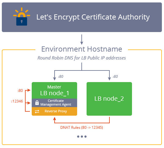 Jika lapisan (layer) tersebut terdiri dari beberapa node sejenis (misalnya beberapa server NGINX), maka selama periode pembaruan sertifikat, semua trafik HTTP yang masuk juga akan diarahkan ke master node, tempat CMA proxy aktif. Hal ini dicapai dengan menambahkan aturan routing sementara menggunakan DNAT, agar permintaan validasi domain bisa ditangani oleh CMA secara langsung.